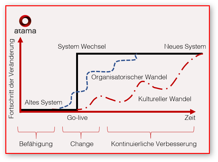 With change management tailored to the company, the change process is designed and controlled in such a way that the implementation of strategies and objectives is feasible and manageable for the company and its employees. Change management also means minimising risk and maximising success for companies and projects. The benefit lies in quickly implementing and advancing the changes that IT projects entail, which has a positive effect on the company's success. The primary objective is to firmly integrate change management into the overall project